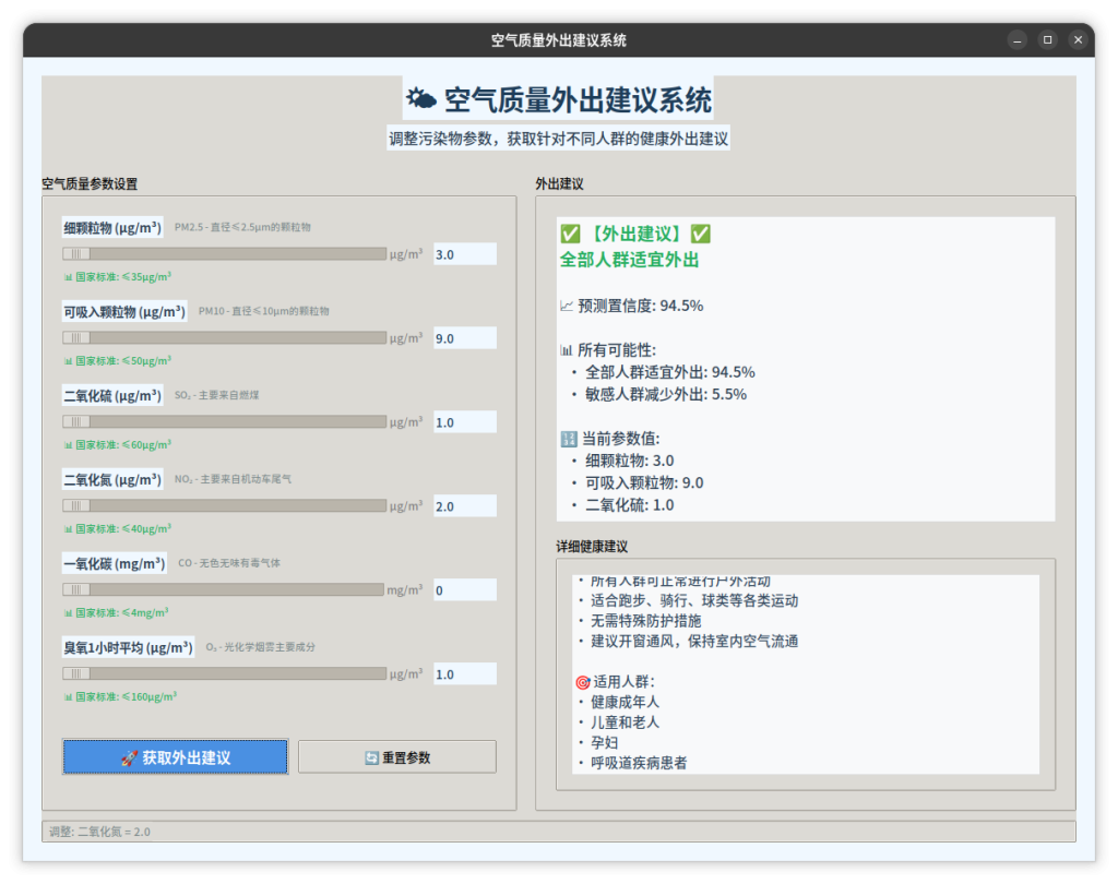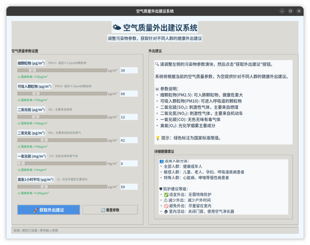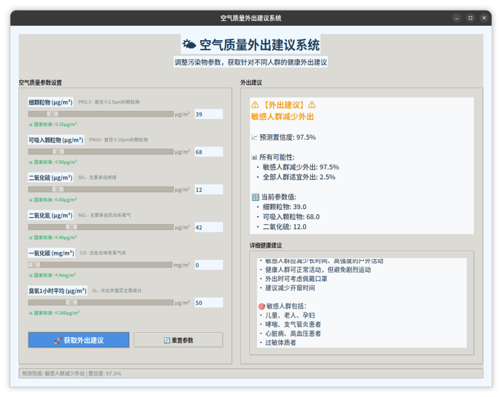 这个完整的代码包可以直接使用,包含了数据处理、模型训练、GUI界面等所有功能。训练完成后,您可以通过GUI界面实时调整污染物参数,获取针对不同人群的健康外出建议。